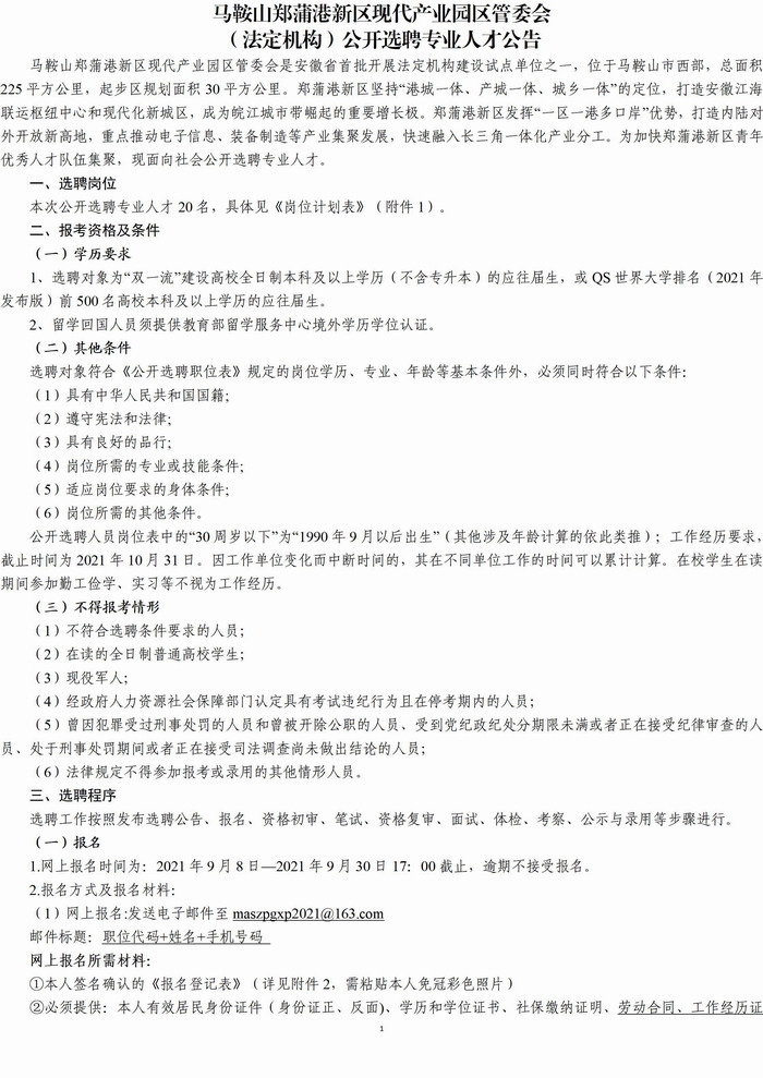 附件8:馬鞍山鄭蒲港新區(qū)現(xiàn)代產(chǎn)業(yè)園區(qū)管委會(法定機(jī)構(gòu))公開選聘專業(yè)人才公告